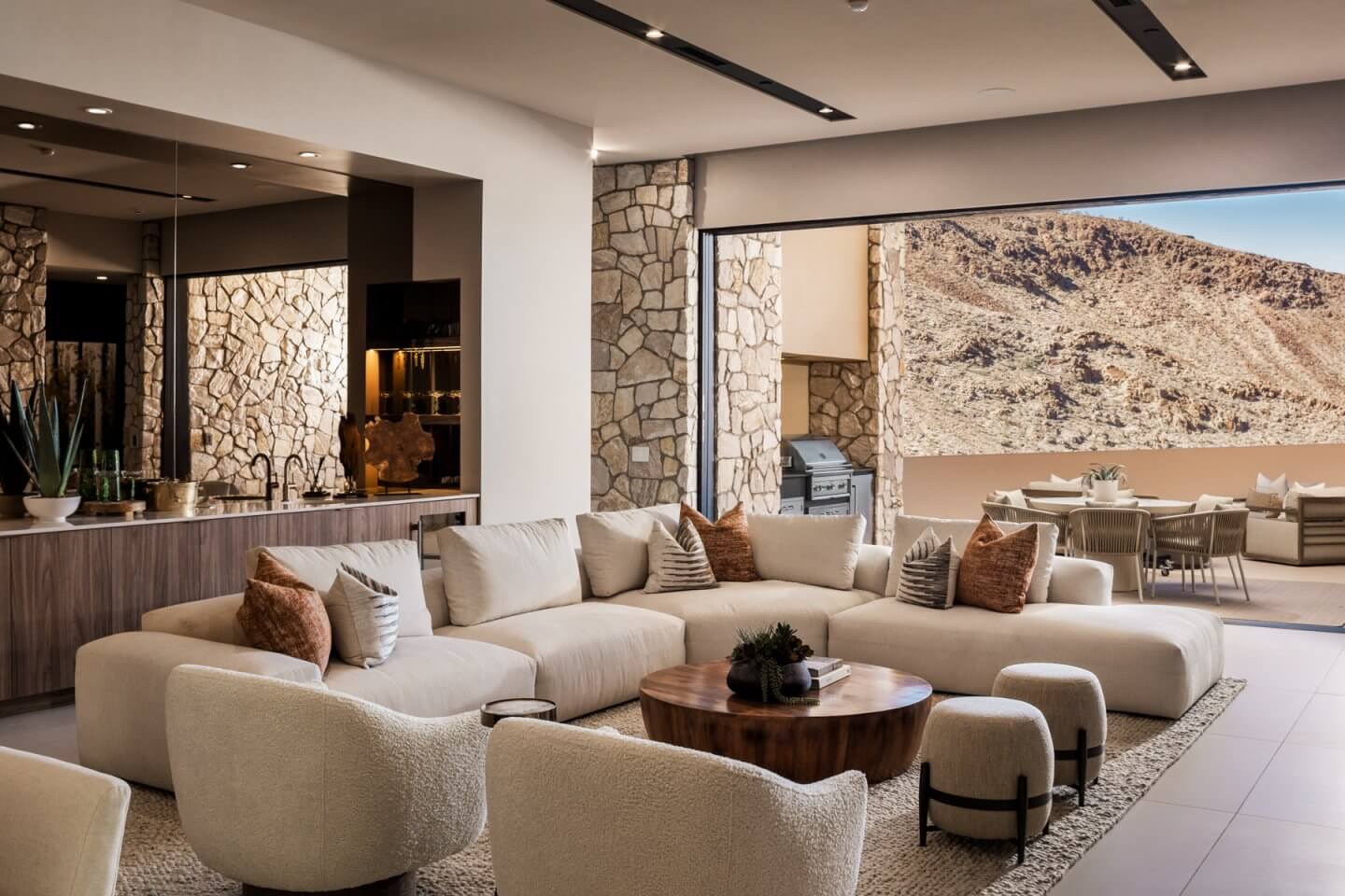 A study in balance and proportion, this single-level residence pairs expansive glazing with warm, tactile finishes. Dual primary suites provide privacy for residents and guests alike, while generous terraces extend living outward toward canyon and valley views. The experience is intimate yet open, designed for effortless entertaining and restorative solitude.